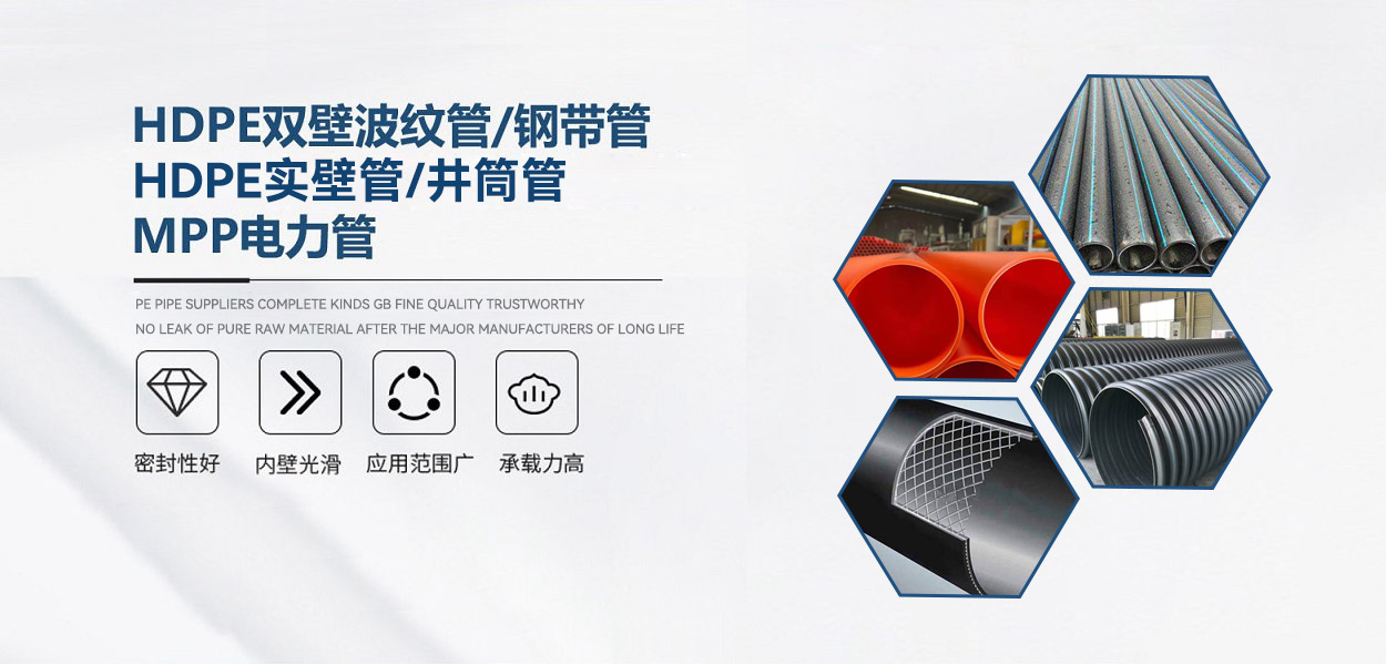 专业从事研发、生产PE给排水管材管件、PE钢丝网骨架复合管材管件、PE燃气管材管件、MPP电力护套管材管件、HDPE双壁波纹管及HDPE钢带增强聚乙烯螺旋波纹管等系列产品
